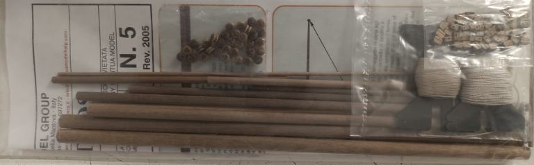Costruzione a fasciame, ordinate, ponte, chiglia e tutti gli altri particolari in legno sono tagliati al laser, alberatura in tondini di legno.