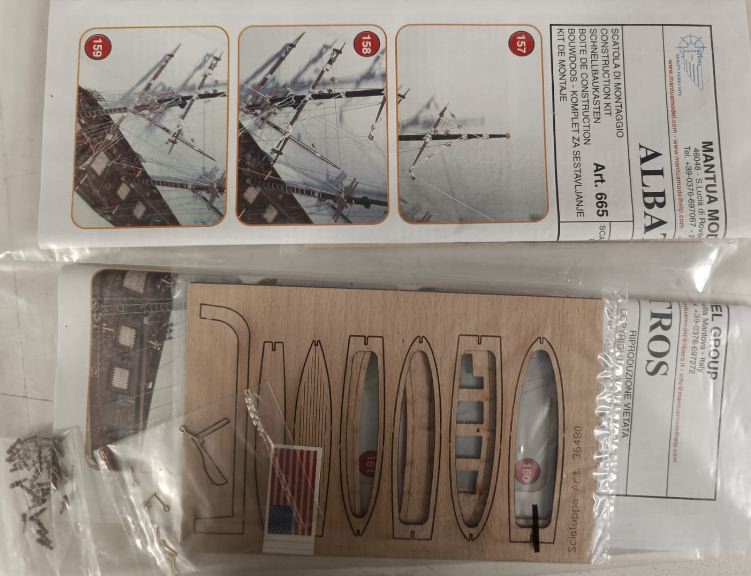 Costruzione a fasciame, ordinate, ponte, chiglia e tutti gli altri particolari in legno sono tagliati al laser, alberatura in tondini di legno.