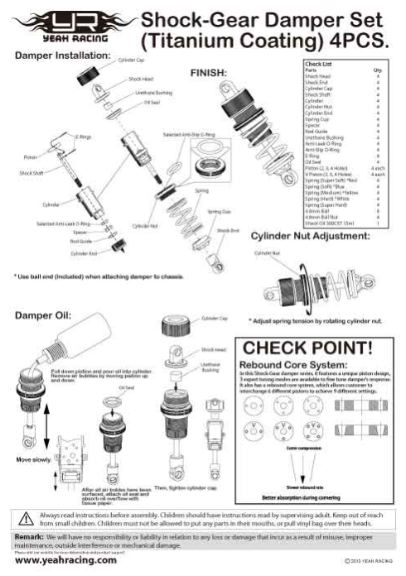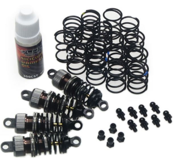 Il nuovo set di ammortizzatori Yeah Racing ha dedicato grandi sforzi per aumentare la durata e la facilità di manutenzione. L’albero dell’ammortizzatore è rivestito in titanio per una maggiore riduzione dell’attrito e una maggiore durata. Per far fronte alla necessità di cambiare periodicamente il pistone dell’ammortizzatore, l’ammortizzatore ha selezionato O-Ring anti-perdite di alta qualità per mantenere l’olio dell’ammortizzatore in posizione. L’alluminio di alta qualità lavorato a CNC è stato utilizzato per costruire questo set di ammortizzatori di fascia alta per la massima durata con il minimo peso.