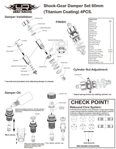 The Yeah Racing 60mm damper set has spent great effort on increasing the durability and maintenance ease. The damper shaft is coated with titanium for minimum friction and longer lifespan. To cope with the need to change the damper piston from time to time, the shock gear have selected premium quality anti-leak O-Ring to keep the damper oil in place. CNC machined premium grade aluminum were used to build this high-end damper set for maximum durability at the minimum weight.