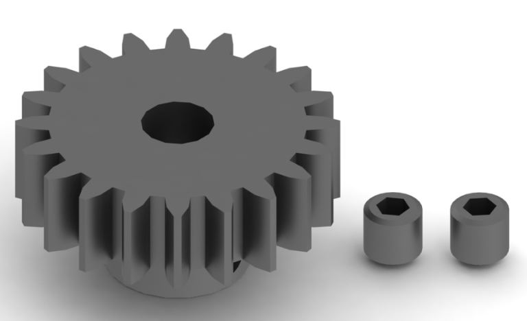 Profilo dentato di precisione per un funzionamento regolare – Doppi fori per viti di precisione per il montaggio di viti di arresto su entrambi i lati dell’albero motore per un montaggio extra sicuro – Per il montaggio su un albero motore da 5 mm. COMPRENDE: 1 x Pignone in acciaio 22T MODULO 1 2 x Grani M4x4mm