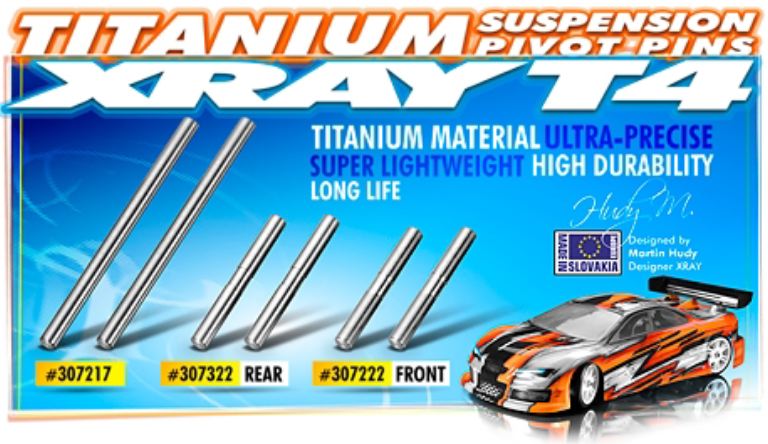 Titanium lower inner pivot pins, ultra-precision hand ground for high durability and long life. Weight savings compared to standard steel pins. Set of 2.