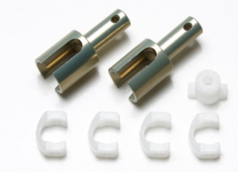 This cup joint set is made of aluminum and it’s made to be used with the TA-06 gear differential unit. The standard cup joints are made of steel. The new aluminum cup joints also feature drive shaft pin protectors, also known as blades so the wear and tear to the cup joint is prolonged.