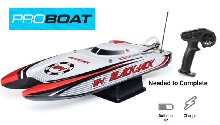 Il Pro Boat Blackjack 24 riprogettato, pronto all’uso, viene fornito con un trasmettitore Spektrum SLT2 a 2 canali 2.4GHz e un supporto per la barca per la manutenzione o l’esposizione. Basta aggiungere il tuo set di batterie 4S (2x 2S 5000mAh) e un caricabatterie compatibile per correre attraverso l’acqua con la stabilità e la velocità del catamarano alimentato a brushless.