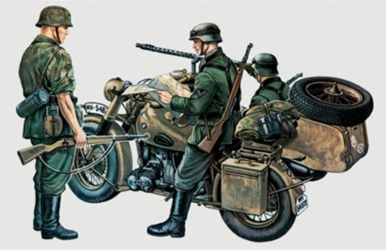 Il sidecar basato sulla BMW R 75 rappresenta, nell’iconografia tradizionale, il prototipo del veicolo motorizzato leggero della Werhmacht durante la Seconda Guerra Mondiale. Utilizzato dalle truppe tedesche per i più svariati impieghi e su ogni fronte : dal collegamento tra reparti, alla ricognizione avanzata. La sua velocità massima arrivava a 92 Km/h. IL KIT CONTIENE, OLTRE AL VEICOLO, 3 MINIATURE.