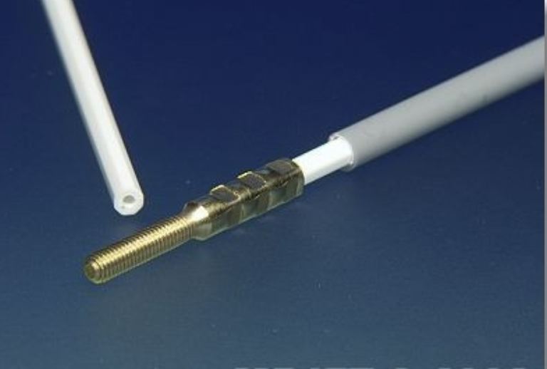Bowden con tubo di plastica di colore grigio, con un tubo interno di plastica bianca dalla forma ottagonale, con rapporto 2:1, rinforzato con un filo d’acciaio di 0,8 mm di diametro e dotato di un raccordo M2.