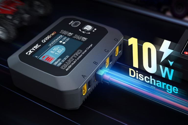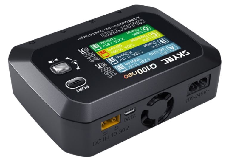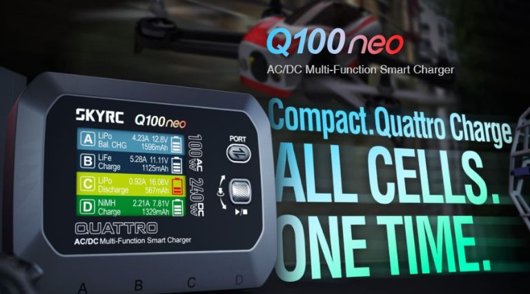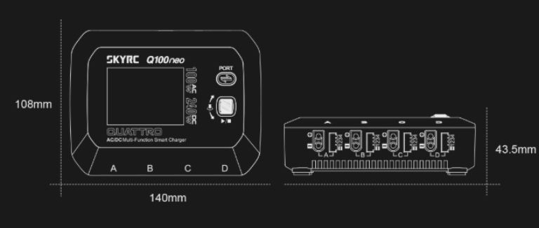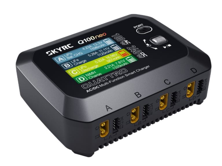 Il SkyRC Q100 Neo ridefinisce la potenza di carica compatto, potente e con quattro uscite di carica intelligenti per la massima flessibilità. Con una potenza totale di 240W DC o 100W AC, il Q100 Neo è pronto per qualsiasi sfida, che si tratti di RC-Racing, FPV o Drone-Soccer.