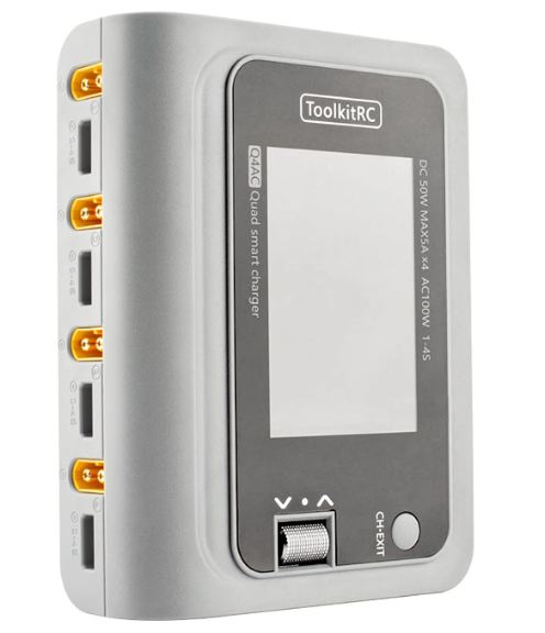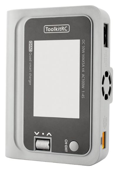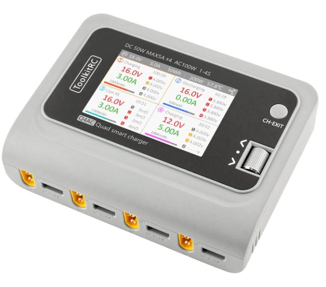Il Q4AC è un caricabatterie a quattro canali con funzione di bilanciamento e display IPS. La navigazione del menu tramite il rullo rende il funzionamento semplice e diretto.