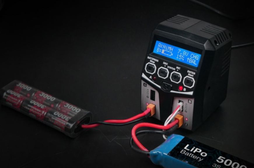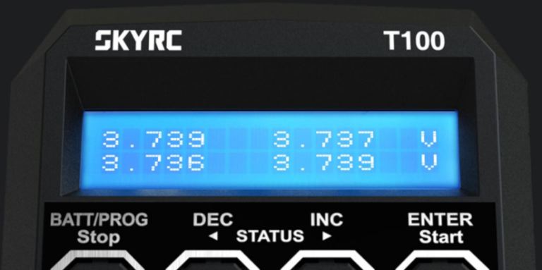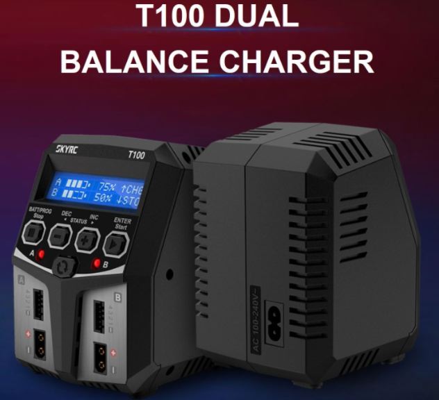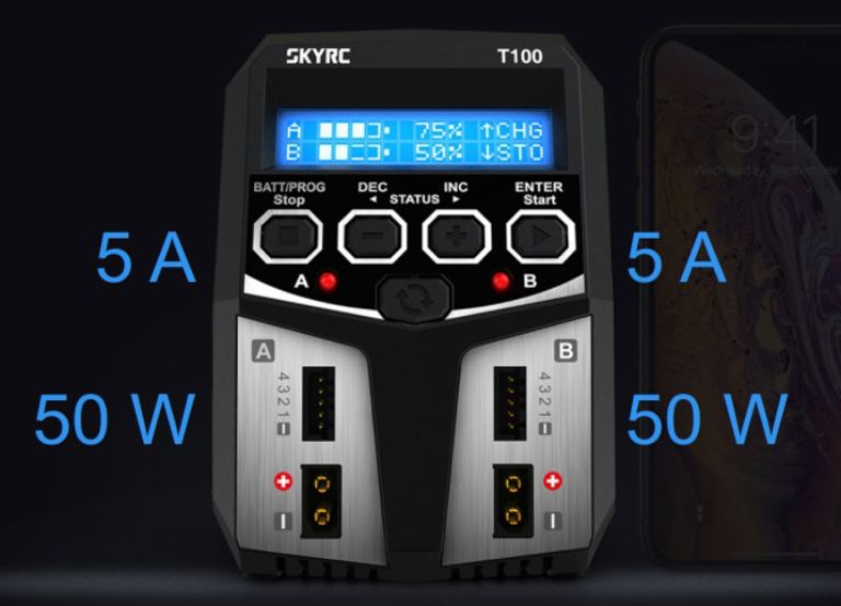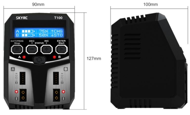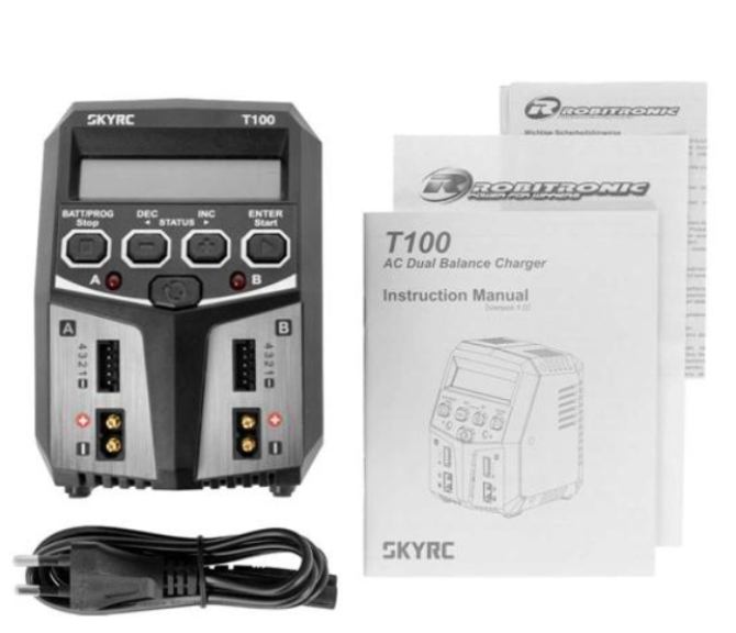 Con una potenza di ricarica di 50 Watt per canale di ricarica, il caricabatterie T100 fornisce una potenza di ricarica più che sufficiente per la maggior parte delle applicazioni. Caratteristiche 2 canali di ricarica indipendenti 2x 50W di potenza di carica e corrente di carica massima di 5.0A Display LCD ad alto contrasto che mostra l’icona di una batteria e le percentuali di carica. 3 decimali per la tensione della batteria 10 Memorie delle batterie Modalità di carica a freddo AGM e Pb Facilità d’uso Connettore XT-60 sull’uscita di carica Monitoraggio della sicurezza