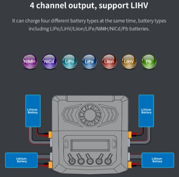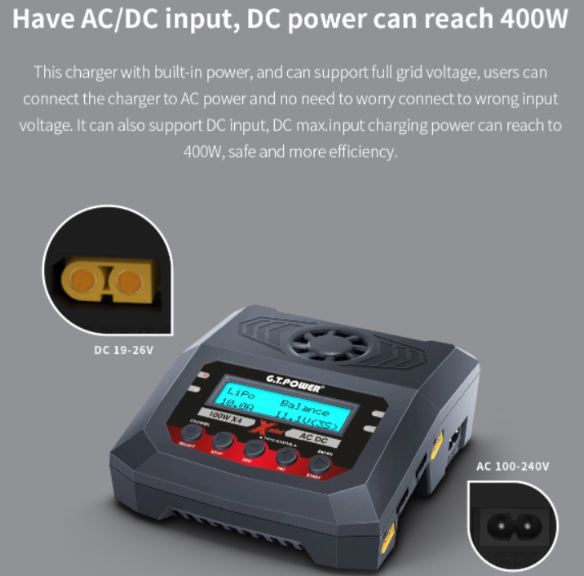 Possono essere collegate al caricabatterie tutte le batterie con connettore XT60, bisogna utilizzare degli adattatori per gli altri tipi di connettore.