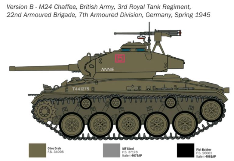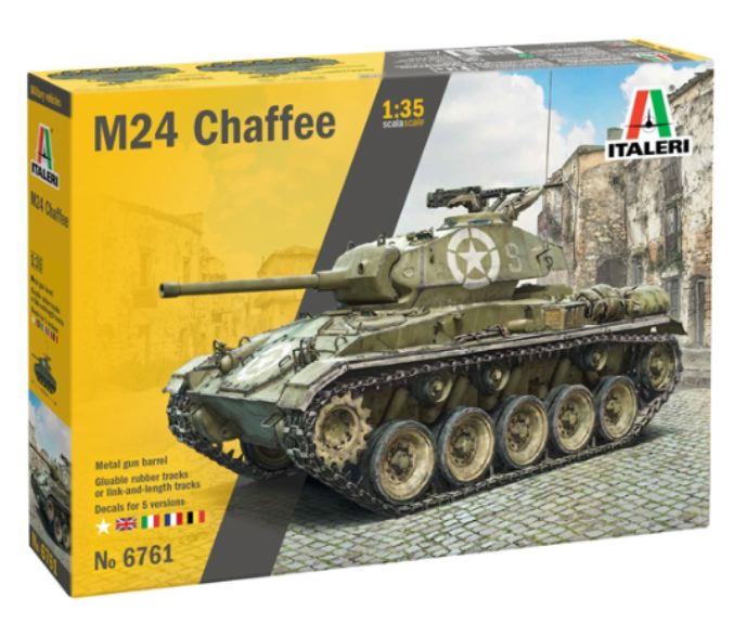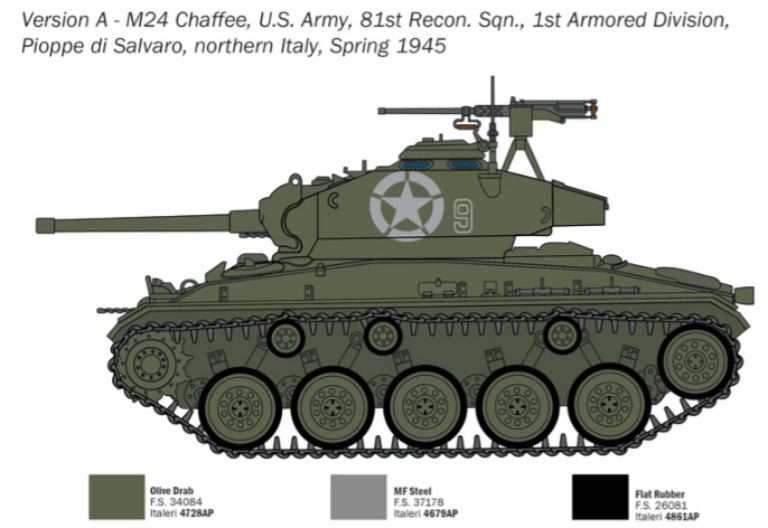 Il carro armato M24 Chaffee venne distribuito ai reparti dell’esercito americano a partire dal 1944 per avere, sul campo di battaglia, un carro armato leggero in grado di sostituire il datato M3/M5 Stuart. La configurazione dell’M-24 era infatti molto diversa dal suo predecessore ed il suo progetto dimostrò molto valido tanto che può essere considerato uno dei migliori carri leggeri mai realizzati. Agile, robusto ed affidabile era, per essere un “Light Tank”, ben armato potendo contare su un cannone M6 da 75mm con 48 colpi a disposizione. L’armamento del carro era completato con due mitragliatrici Browning da 12,7 mm. Venne anche efficacemente impiegato nelle attività di supporto ravvicinato alla fanteria e a svolgere compiti di ricognizione avanzata. Nel corso del conflitto venne inoltre sviluppata un efficace co-operazione delle unità di M-24 con mezzi corazzati più armati come lo Sherman nelle sue varie versioni.