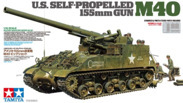 Questo è un modello di assemblaggio degli Stati Uniti 155 millimetri M40 semoventi. È un soggetto mai visto prima nella line-up Tamiya di modelli in scala 1/35. Il kit utilizza tutti i nuovi strumenti, ad eccezione delle parti delle sospensioni così come provengono dal kit modello Easy Eight di M4A3E8 Sherman. L’M40 è stato un passo significativo nella meccanizzazione dell’artiglieria dell’esercito americano, abbinando la pistola M1 da 155 mm al collaudato telaio M4 Sherman. L’armatura era leggera dato l’uso previsto come un’arma a lungo raggio (erano efficaci fino a 23,5 km) lontano dalla linea del fronte, mentre il layout è stato modificato dalla M4 per consentire un grande scompartimento di combattimento nella parte posteriore per ospitare la grande arma. Era dotato di sospensioni a molla a voluta orizzontale (HVSS). Oltre 400 furono prodotti prima della fine della seconda guerra mondiale anche se non hanno mai combattuto nel conflitto, un esempio del loro prototipo T83 ha fatto.