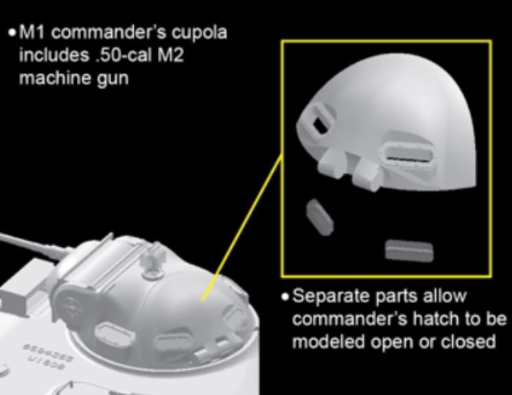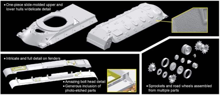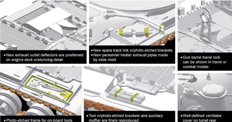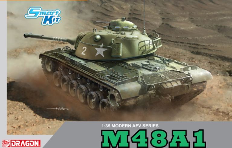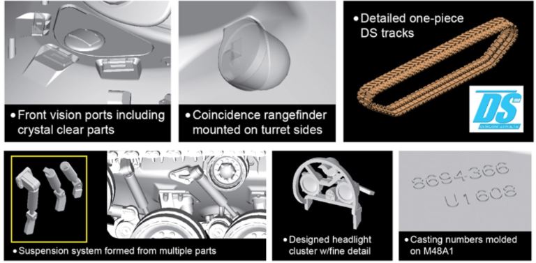 Questo ultimo kit M48A1 si basa sulle precedenti versioni M48A3, retrodatando elementi ove necessario per consentire la rappresentazione del serbatoio M48A1. In effetti, questo è il primo M48A1 mai disponibile come kit di iniezione. Modifiche importanti includono una nuova cupola del comandante, un nuovo scudo per il cannone e un nuovo mantello di tela per la torretta. Quest’ultimo è formato da DS per replicare autenticamente il materiale originale. Anche i paraurti sono nuovi di zecca. Il ponte motore e la piastra posteriore sono corretti per il motore a benzina a 12 cilindri e il motore ausiliario a 8 cilindri utilizzati nei primi veicoli M48, mentre anche lo scafo superiore è stato recentemente lavorato. È interessante notare che la torretta accuratamente sagomata ha una sottile trama di fusione e numeri di lancio in rilievo. Con il know-how e le capacità tecnologiche di Dragon applicate a questo argomento relativamente moderno,