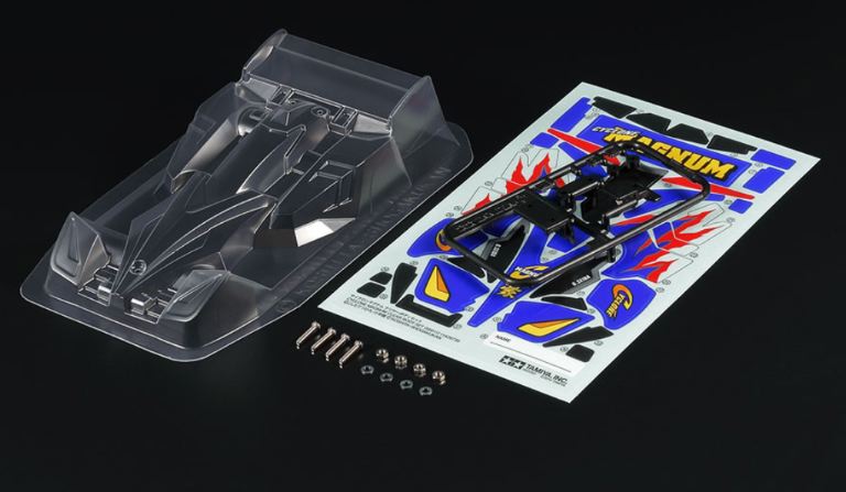 Versione leggera in policarbonato di 0,4 m di spessore della Cyclone Magnum, una delle auto più popolari della serie Mini 4WD completamente ricoperta.