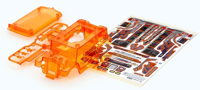 Carrozzeria in edizione limitata, basato sul kit Dyipne (FM-A) Mini 4WD. (Articolo 18717) Il set è composto da un carrozzeria in plastica ABS trasparente arancione e adesivi dedicati (una variazione di colore degli adesivi inclusi nell’articolo 92419 Dyipne Silver Metallic).