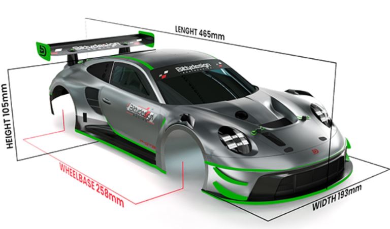 Le forme da auto da gara GT3 sono state adattate alle misure necessarie per l’utilizzo con i modelli elettrici 190mm la fase di progettazione ha richiesto diversi mesi per rifinire ogni minimo particolare, la cura dei dettagli è stata maniacale al fine di proporre una carrozzeria che potesse ottimizzare al meglio l’aerodinamica e al tempo stesso rimanere reale nelle proporzioni ed estetica.