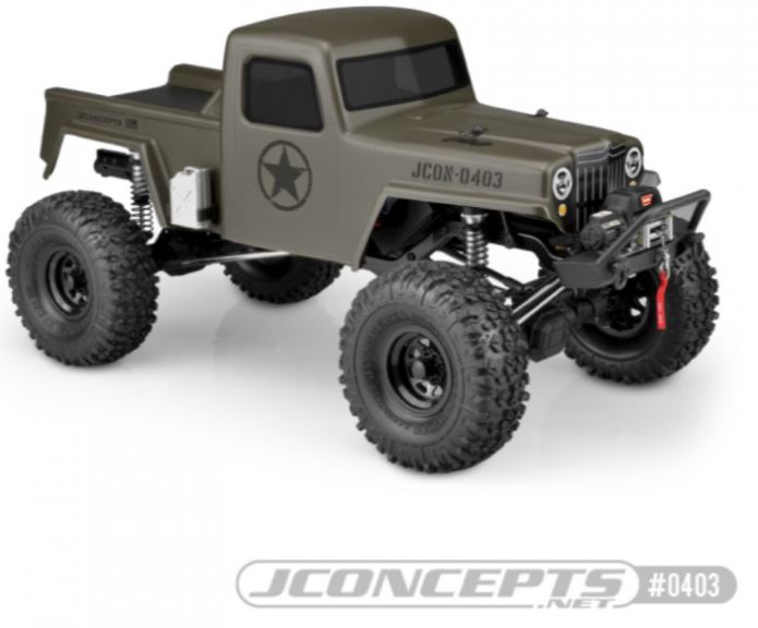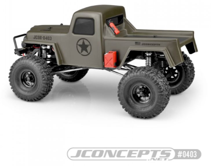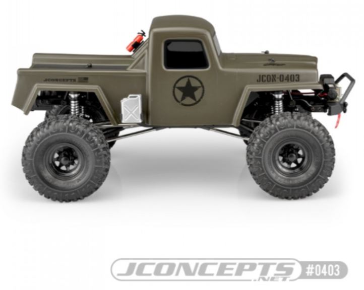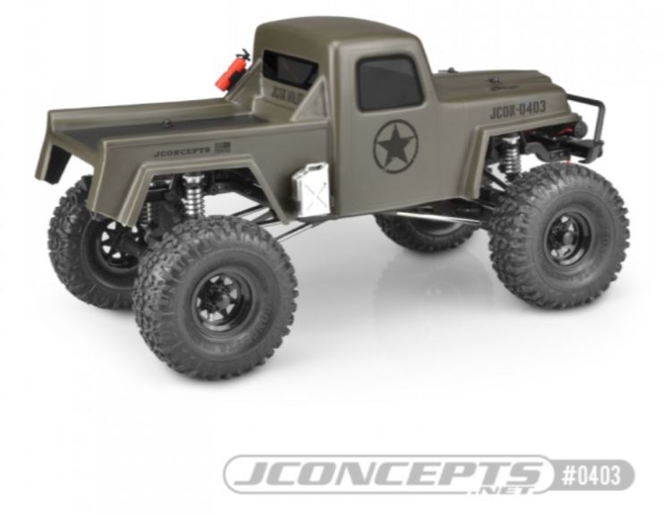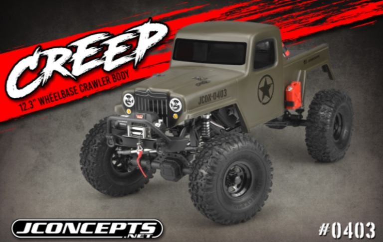 Il camion fotografico JCI Creep è un Element RC Enduro con le assi del pavimento rimosse. Il team di JConcepts ha aggiunto un altro vano batteria (AE # # 42003) sul retro per montare l’impianto elettrico e la scatola del ricevitore. È importante che la carrozzeria del Creep sia montato abbastanza in alto da liberare le protezioni laterali o le assi del pavimento, oppure sia necessario rimuoverli tutti insieme per soddisfare la larghezza ridotta del guscio. Il camion è dotato di pneumatici JConcepts n. 3156-02 Landmines in mescola verde e montati su cerchi con tallonetta Colt n. 3389B. Il paraurti anteriore utilizzato è l’Axial (#AX80125) con configurazione del verricello anteriore RC4wd.