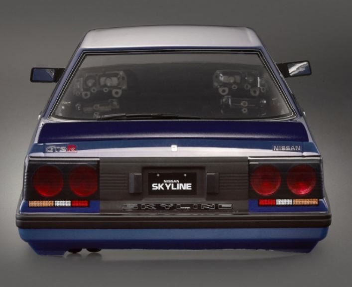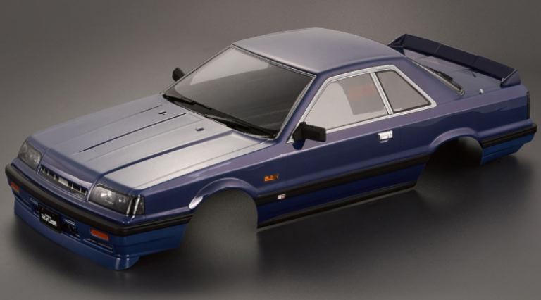 Carrozzeria della Nissan Skyline R31 già verniciata di colore blu e con adesivi già applicati.