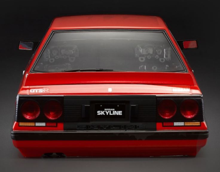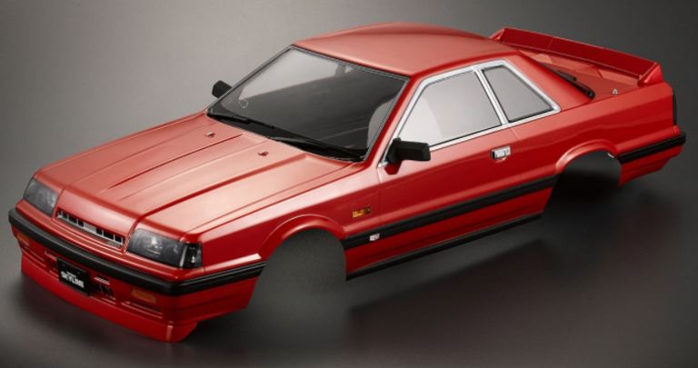Carrozzeria della Nissan Skyline R31 già verniciata di colore rossa e con adesivi già applicati.