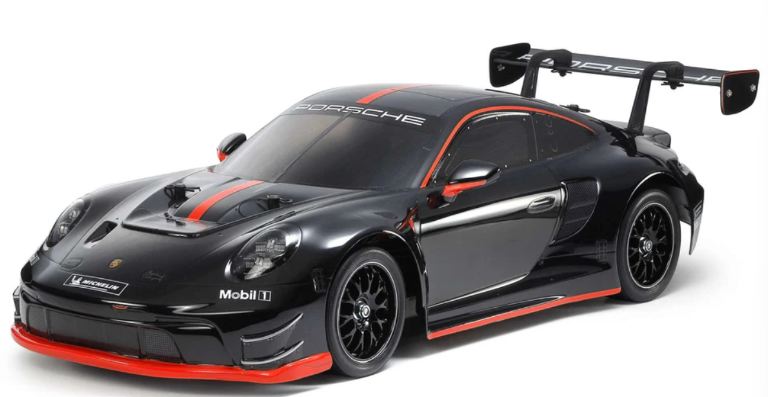 • La carrozzeria in policarbonato leggera e resistente riproduce in modo autentico la forma aerodinamica della Porsche 911 GT3 R (992), con alettone posteriore in policarbonato separato e parabole luci.