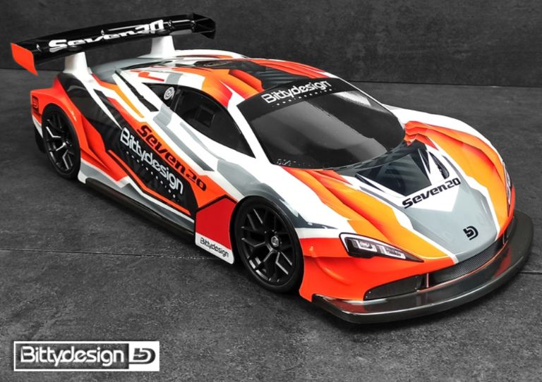 Seven20 è una carrozzeria GT dal look mozzafiato, la parte frontale così ribassata genera un ottimo inserimento in curva, la cabina ribassata e le fiancate allargate stabilizzano i flussi d’aria che convogliati nel grande alettone posteriore rendono il modello facile da guidare, la carrozzeria è ben bilanciata, il centro di rollio abbassto e il miglioramento dei vostri tempi sul giro è garantito.