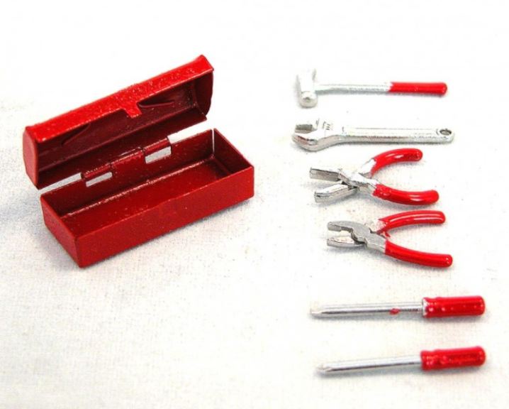 EZCR017 Cassetta in metallo con attrezzi. Apertura incernierata. Contiene vari attrezzi in metallo : 2 cacciaviti, 2 pinze, martello, chiave inglese tutti in metallo verniciato.