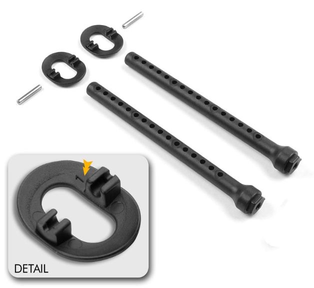 The body posts are a direct replacement for the standard body posts in the T2 and NT1, while the body holders have the elevated mounting. This makes body height adjustment very quick and easy. In a few short seconds and two clicks, you can exchange all the body holders and then adjust the body height. There are two optional body height adjustment possibilities by +1mm and by +2mm. The new body height adjustable body posts are available separately in a pair of front and rear, allowing for independent front and rear body height adjustments. Looking for cutting edge, fine-tuning adjustment? You have it now.