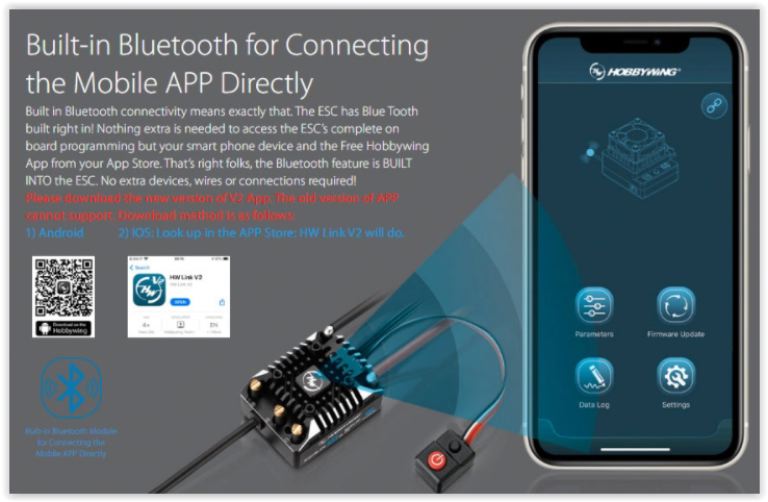 il nuovo ESC AXE incorpora il ricevitore trasmettitore Bluetooth, questo consente la connessione diretta al tuo cellulare smartphone tramite la app Hobbywing disponibile per IOS & Android, tutto senza fili e senza dover acquistare altro.