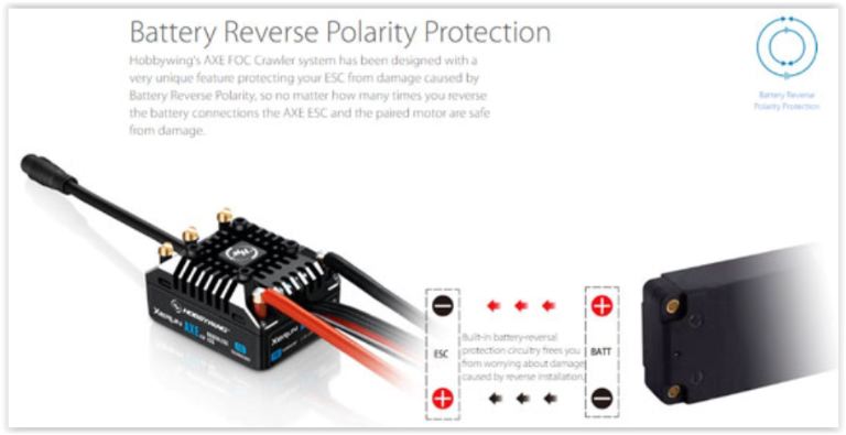Questo nuovo sistema AXE è stato progettato e realizzato con una caratteristica unica nel suo genere, il regolatore XERUN AXE incorpora un sistema di protezione dai danni causati dalla inversione di polarità, nel caso distrattamente siano invertite le polarità quando colleghi ESC al pacco batterie, tutto il sistema (ESC+MOTORE) saranno protetti dal danneggiamento, questa protezione è unica nel suo genere.
