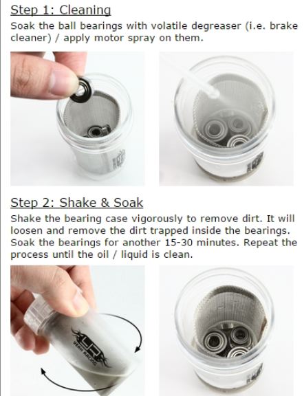 Simply put the bearings/screws/small parts inside the cleaning case, add cleaners and shake the case until dust/dirt is being removed.