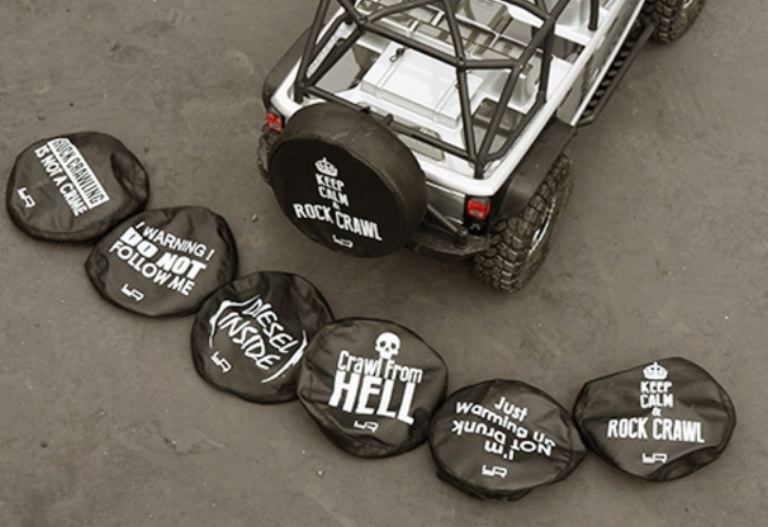 Add character to your crawler rig with our series of tire covers with a wide variety of smart and clever messages. White ink printed on tough synthetic leather to help deal with harsh conditions and for easy cleaning after trail runs.