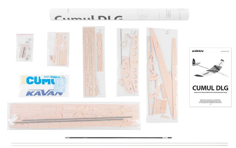 Il kit contiene: balsa tagliata a CNC e parti in liteply/compensato, tubi in carbonio per i longheroni delle ali principali, trave di coda in carbonio, set di accessori, foglio di adesivi, piano di costruzione a grandezza naturale, manuale di istruzioni.