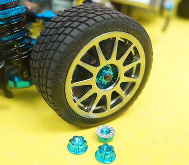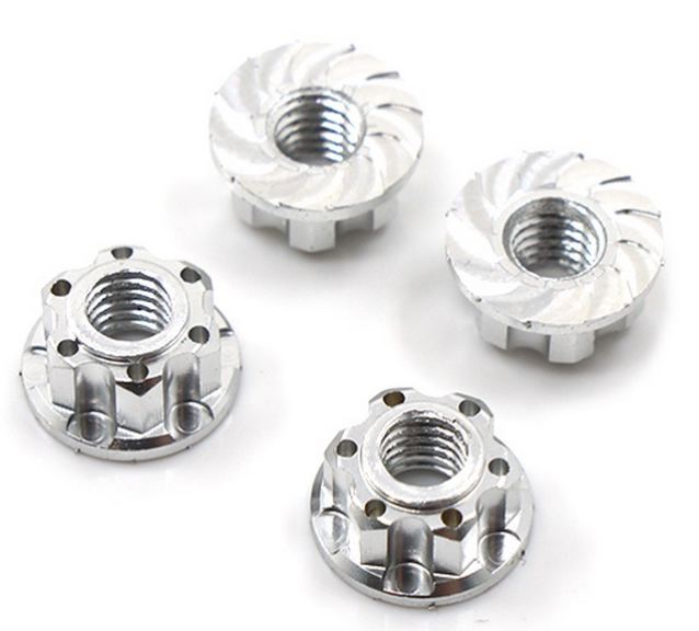 Questi dadi ruota di alta precisione e realismo sono flangiati e zigrinati per una maggiore sicurezza di bloccaggio e sono caratterizzati da un design leggero.