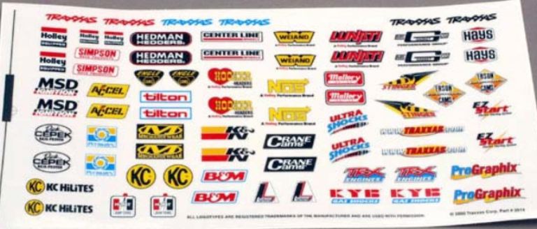 Il foglio comprende anche vari loghi Traxxas tra cui le famose decalcomanie TRAXXAS.COM. Tutti i loghi sono prodotti fedelmente e sono completamente concessi in licenza.