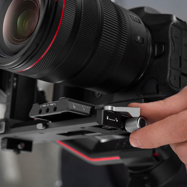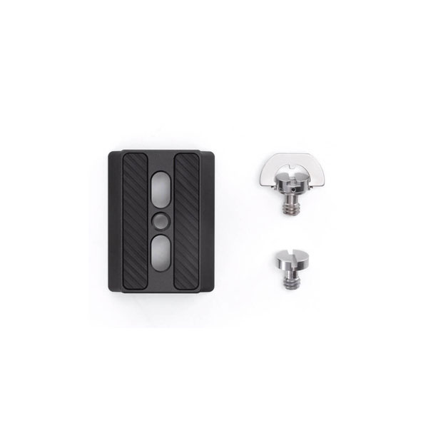 La piastra a sgancio rapido (superiore) DJI R è la metà superiore del sistema di piastre a sgancio rapido DJI R, per la rapida installazione e rimozione del corpo macchina. Contiene due viti D-Ring 1/4”-20 per l’installazione della fotocamera, una piastra a sgancio rapido (superiore) e un rialzo per fotocamera.