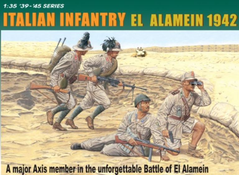 Dragons newest 1/35 scale figure set depicts four Italian soldiers fighting in the hot and dry deserts of North Africa. Indeed, it completes a trilogy of El Alamein sets after the earlier No. 6389 DAK Infantry and No. 6390 8th Army figure sets. This set of Italian figures is set to be a singular success, especially considering its the very first in decades to be produced to an up-to-date standard. These Italian infantrymen with full equipment are sharply molded and realistically posed for desert fighting, with every item in the box being a brand new tooling. Their brand new weapons include an M1934 pistol, M1938 submachine gun, M1930 light machinegun and M1891/1938 carbine. A variety of uniform items and headgear also offer modelers exciting prospects. With this perfect combination of molding technology, maximum detail and innovative subject matter, this set of Italian Army infantrymen in North Africa will prove to be a valuable and popular release.