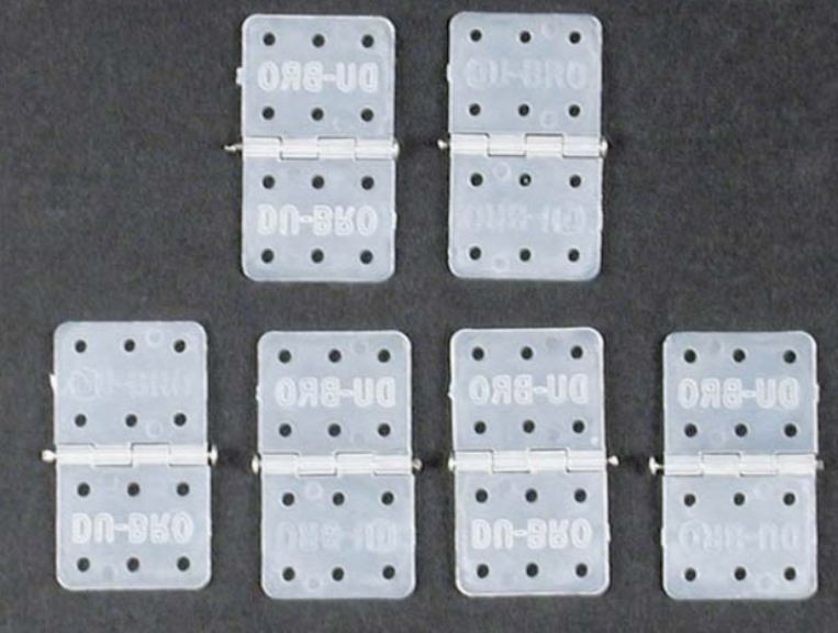 Cerniere in nylon DU-BRO – costruite con la massima precisione. Le cerniere vengono testate singolarmente e fornite con una chiavetta bloccata. Ci sono 6 punti di fissaggio su ogni lato per garantire una tenuta ottimale. Dimensioni: 16 x 28 mm Peso: 0,5 grammi per cerniera Made in USA Dubro 116