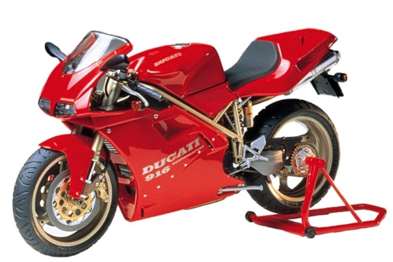 Ducati, la rinomata casa motociclistica italiana, è molto apprezzata dagli appassionati di motociclismo di tutto il mondo. La loro attuale moto 916, il top di gamma, è stata presentata al pubblico durante il Salone dell’Automobile di Milano del 1993. Negli ultimi anni, la Ducati è stata una forza dominante ai Campionati Mondiali di Superbike. La loro 916 è stata sviluppata utilizzando le più recenti tecnologie e competenze nel campo delle corse, ed è diventata una macchina base molto efficace prima di questi Campionati. Il suo motore bicilindrico a L raffreddato a liquido da 114 cavalli, 916cc, utilizza un sistema di iniezione di carburante controllato da computer e il tradizionale sistema di funzionamento delle valvole Desmodromiche Ducat. Questo sistema di valvole utilizza la meccanica a camme sia per l’apertura che per la chiusura delle valvole, mentre un sistema convenzionale chiude le valvole solo con molle. Questo potente motore è montato in un telaio tubolare in acciaio al cromo-molibdeno, leggero ed estremamente rigido. La sospensione posteriore del forcellone oscillante utilizza un monobraccio per il cambio rapido dei pneumatici durante la competizione. Gli ammortizzatori Showa e le pinze dei freni Brembo sono utilizzati ad entrambe le estremità. La 916 è dotata di un sistema di disassamento delle ruote regolabile a 2 stadi. Il suo design aerodinamico del cofano è molto caratteristico, a differenza di altre moto da corsa-replica. Il cofano anteriore è dotato di aperture per la presa d’aria del motore e monta i doppi fari. Il serbatoio del carburante è ergonomicamente scolpito per adattarsi alla diversa postura del pilota durante la guida dura. La 916 è una vera e propria moto da corsa legale da strada, all’avanguardia per prestazioni e stile.