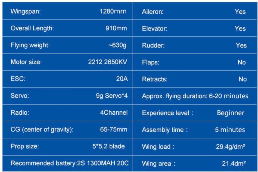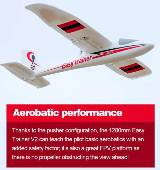 Grazie alla configurazione l’Easy Trainer V2 da 1280 mm permette al principiante acrobazie aeree di base è anche un’ottima piattaforma FPV in quanto non ci sono eliche che ostruiscono la visuale davanti!
