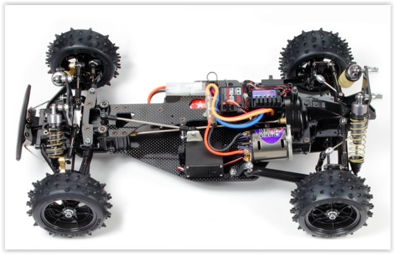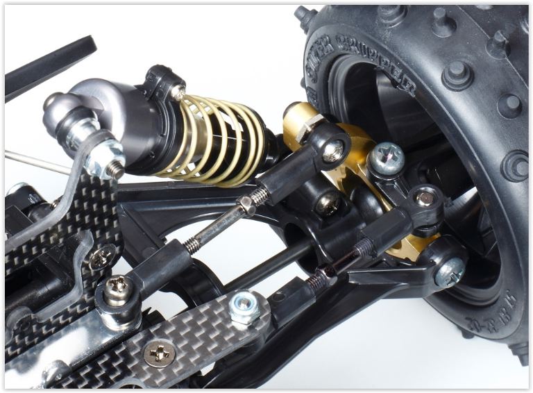 I differenziali a sfera anteriore e posteriore riprogettati offrono eccellente affidabilità e facile manutenzione, lavorando in tandem con il centro unidirezionale integrato per fornire un movimento sicuro. Il cuscinetto unidirezionale può essere bloccato. Gli alberi di trasmissione universali presentano lo stesso design di quelli utilizzati nelle attuali parti della serie TRF, al fine di massimizzare la trasmissione di potenza e migliorare la resistenza allusura. Le sospensioni a doppio braccio oscillante sulle 4 ruote sono supportate da 4 ammortizzatori ad olio dotati di cilindri in alluminio, mentre la parte anteriore e quella posteriore del modello sono dotate di stabilizzatori. I montanti anteriori in alluminio offrono unaffidabilità eccellente e i cuscinetti a sfera nei bracci di collegamento dello sterzo si combinano con la piastra in fibra di carbonio spessa 2mm per offrire una risposta dello sterzo lineare.