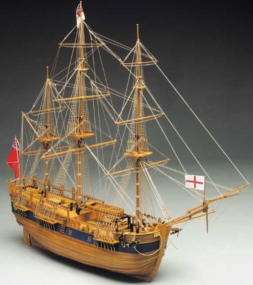 Tutti i particolari in legno sono pretagliati a laser. 14 bocche da fuoco, bandiera stampate su seta, bigotte e bozzelli in legno, accessori e decorazioni in ottone, manovre funzionanti con canapa.