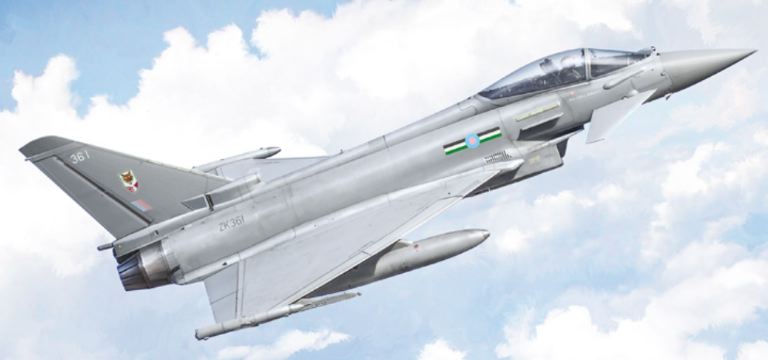 Il progetto Eurofighter, sviluppato a partire dalla seconda metà degli anni ’80 da un pool di aziende europee, aveva l’obiettivo di realizzare un avanzato velivolo da combattimento multiruolo con una forte specializzazione nell’intercettazione. Il risultato del progetto è il “Typhoon” che costituisce oggi uno dei migliori caccia da superiorità aerea a livello mondiale. La sua struttura aerodinamica si caratterizza per l’ala a delta e le alette canard. I suoi due motori turbo jet con postbruciatore garantiscono prestazioni eccellenti e gli permettono di raggiungere i Mach 2. L’elevata tecnologia di bordo, esaltata dal sistema di controllo fly-by-wire, permette di ottenere una grande maneggevolezza nel combattimento aereo. La Royal Air Force Britannica, assieme alle forze aeree di Germania ed Italia, è il principale utilizzatore dell’Eurofighter con 160 esemplari impiegati nei reparti di volo.