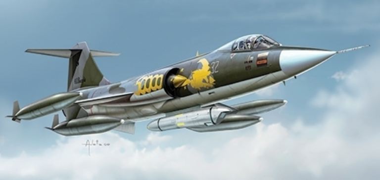 Il Lockheed F-104 Starfighter è uno tra i più famosi caccia della Storia dellaviazione ed è anche uno tra i più longevi con una vita operativa iniziata alla fine degli anni 50 e conclusasi, per alcune aviazioni militari, alla metà degli anni 2000. Aereo unico per struttura aerodinamica con la fusoliera allungata e le superfici alari estremamente ridotte. La sua struttura lo rendeva ideale come caccia intercettore in grado di superare, grazie alla spinta del motore turbogetto General Electric J79, Mach 2,2 con una straordinaria velocità di salita in quota. Era però poco manovrabile e difficile da pilotare. LF-104G Starfighter fu prodotto su licenza da diverse industrie aeronautiche Europee. E diventato, a partire dalla metà degli anni 60, il caccia intercettore di riferimento di molti Paesi NATO tra cui lItalia, la Germania, lOlanda, la Grecia e la Turchia. Larmamento era sostanzialmente quello delle versioni originali con un cannone Vulcan da 20 mm. e la possibilità di trasportare sotto le ali missili aria-aria, bombe, o serbatoi supplementari per aumentarne lautonomia di volo. Al tradizionale compito di caccia intercettore si è affiancato anche quello di ricognitore. LF-104G è stato così dotato di un pod esterno dedicato da ricognizione Orpheus che forniva ottimi risultati operativi.
