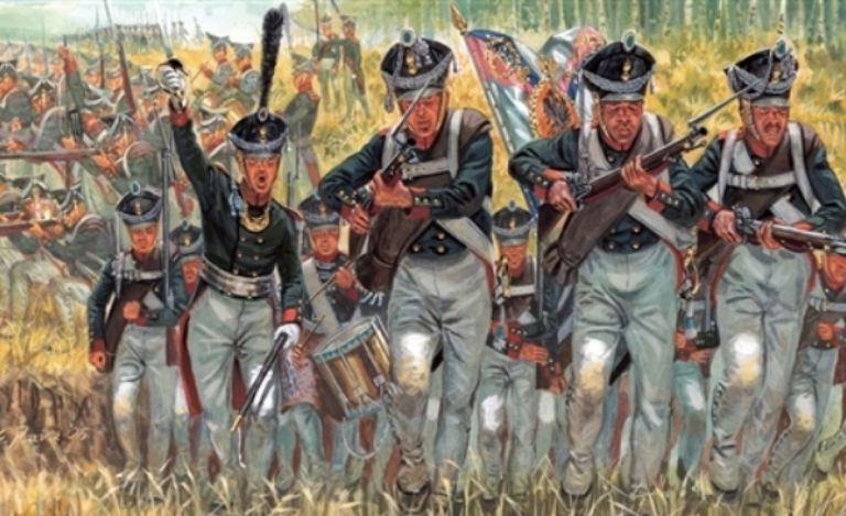 La fanteria dello Zar Alessandro I è qui riprodotta con le uniformi in uso durante il tardo periodo delle battaglie Napoleoniche. A Borodino nel 1812 o durante la cosiddetta battaglia delle nazioni a Lipsia nel 1813 i fanti del già riformato esercito russo indossavano queste uniformi. Ai soldati e agli ufficiali sono affiancati i tamburini e i porta stendardo con le insegne del reggimento e dello Zar.