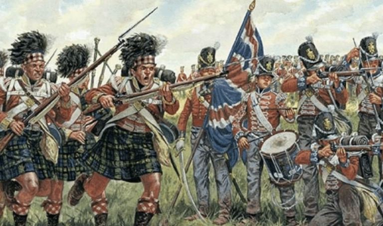 Redcoat è il termine utilizzato per indicare il soldato inglese e deriva dal colore dell’uniforme utilizzata dalla maggior parte dei reggimenti. Le “giubbe rosse” sono qui affiancate da un reggimento scozzese con il caratteristico kilt, in dotazione dal 1739. Il più noto reggimento scozzese è il 42.mo Royal Highlander Regiment “The Black Watch” con i colori del tartan blu, verde e nero. Ha partecipato alla Campagna Peninsulare nel 1812 e alle battaglie di Quatre Bras e Waterloo nel 1815.
