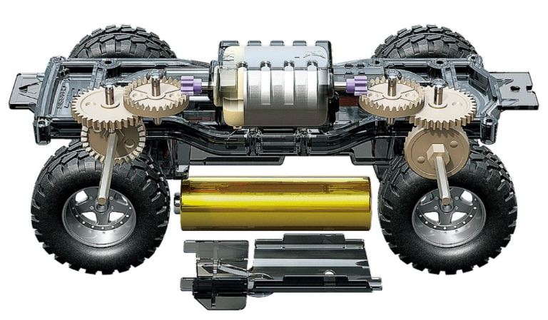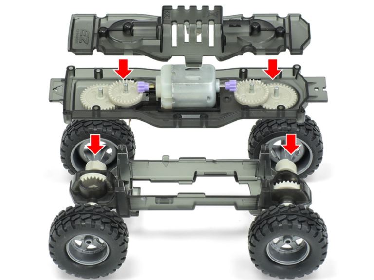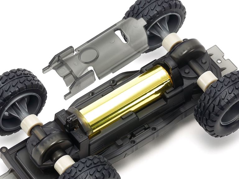 Viene utilizzato un motore centrale a doppio albero (motore tipo 130) come nei kit delle mini4WD-PRO.
