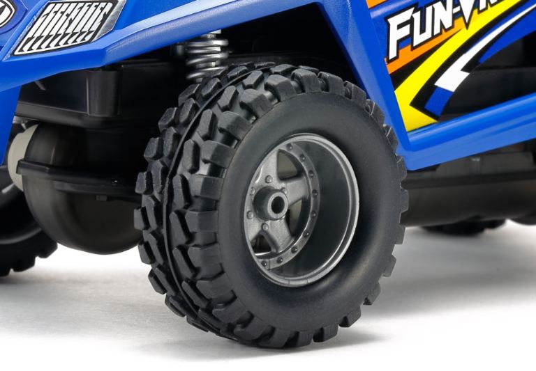 I cerchi leggeri e resistenti sono stampati in polipropilene color argento ed abbinati a pneumatici da fuoristrada in elastomero nero realistico che aiutano a salire su pendii ripidi.