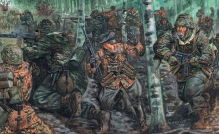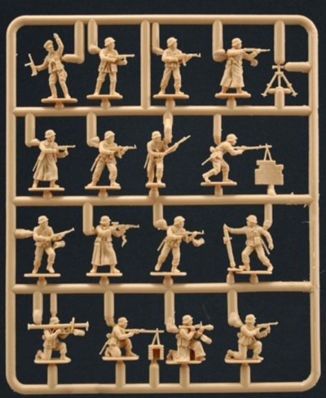 Il 16 dicembre del 1944, le forze tedesche attaccarono attraverso la foresta delle Ardenne, in Belgio, la prima armata statunitense. Fu lultima offensiva della Wermacht sul fronte occidentale prima della rese definitiva nel 1945. Il piano Wacht am Rhein prevedeva, da parte del Generale Von Rundstedt, limpiego di numerosi reparti delite della Wehrmacht e delle Waffen SS. Il momento saliente delloffensiva fu lassedio di Bastogne, del 21 dicembre 1944, difesa dalla 101.ma Divisione Aviotrasportata Americana. Nel kit i figurini sono equipaggiati con linnovativo Sturmgewehr 44 che di fatto è stato il precursore dei moderni fucili dassalto.