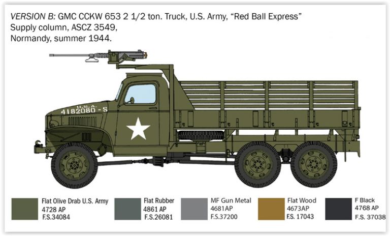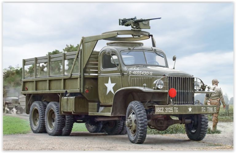 Il camion GMC 2 ½ ton è stato costruito in un numero elevatissimo di esemplari e può essere considerato la spina dorsale della logistica dell’esercito americano durante la Seconda guerra mondiale. Caratterizzato da una struttura molto robusta ed affidabile, che aveva il suo punto di forza nelle buone prestazioni “off-road” grazie alle sei ruote motrici e all’efficace design delle sospensioni, venne realizzato in numerose varianti. Oltre alle più diffuse versioni “cargo” con cabina aperta o chiusa, a “passo lungo” e a “passo corto”, vennero sviluppate anche delle configurazioni, alcune di esse realizzate direttamente “sul campo”, per impieghi più specifici e puntuali. Il suo ruolo è stato fondamentale per soddisfare le impegnative necessità logistiche successive alle prime fasi dello sbarco in Normandia con il trasporto e la movimentazione di impressionanti quantità di truppe e materiali.