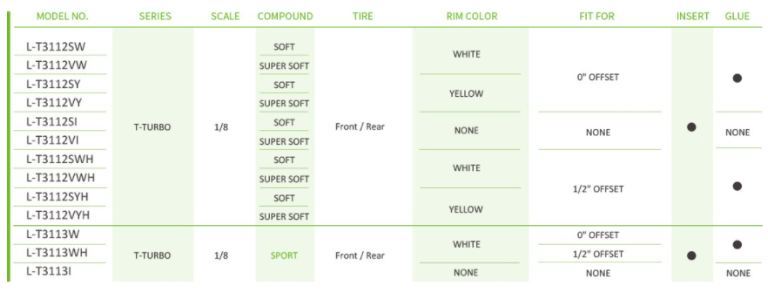 Consulta la nostra Tabella pneumatici-cerchi per verificare se questo set di gomme Louise RC è adatto alla tua auto RC.